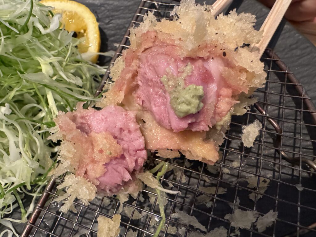 赤身や脂の旨みを最大限に引き出すため、独自の調理法を採用。公式HPには「低温揚げ•••二度揚げ•••真空調理? 否、揚雫です」と書かれています。素人にはよくわかりません(笑)