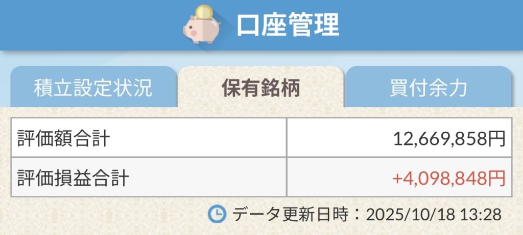 評価額合計は12,669,858円になりました。変わらず評価額1,200万円台を推移しています。