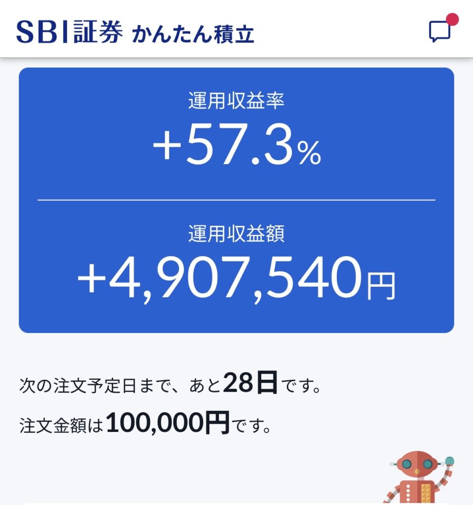 運用収益率+57.3%、運用収益額+4,907,540円となりました。