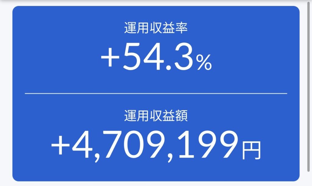 運用収益率+54.3%、運用収益額+4,709,199円となりました。