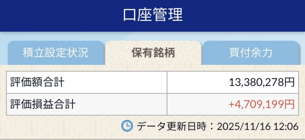評価額合計は13,380,278円になりました。1,300万円台が定着してきたでしょうか。