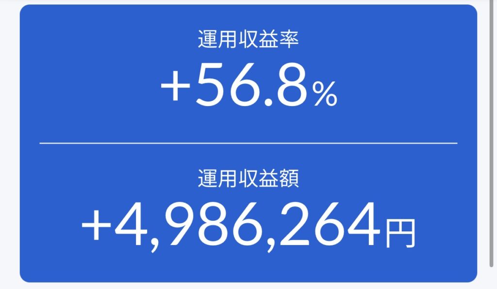 運用収益率+56.8%、運用収益額+4,986,264円となりました。