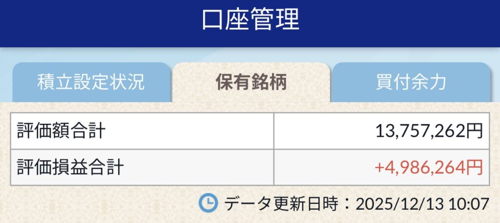 評価額合計は13,757,262円になりました。1,400万円が近づいてきました。