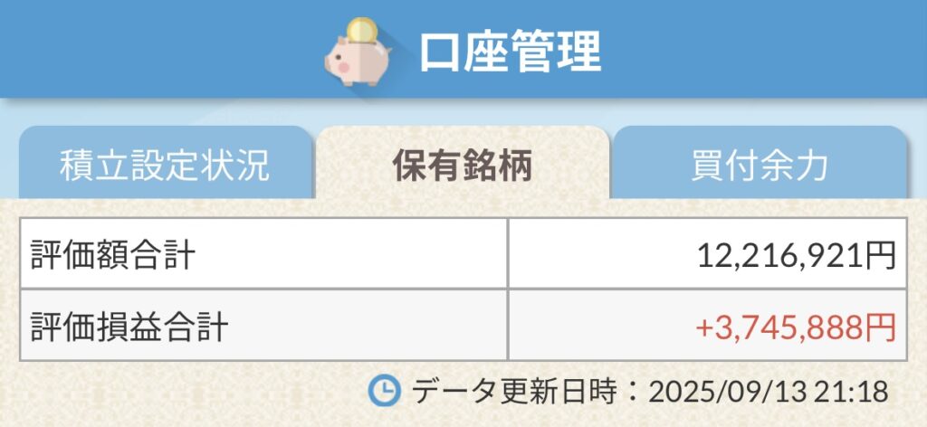 評価額合計は12,216,921円になりました。1,200万円台を推移しています。