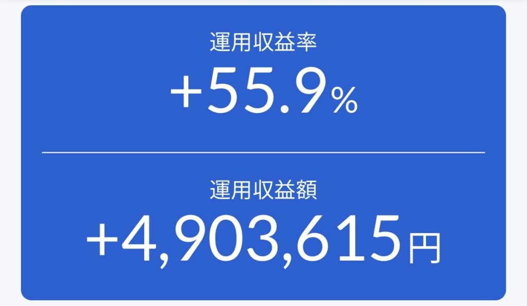 運用収益率+55.9%、運用収益額+4,903,615円となりました。