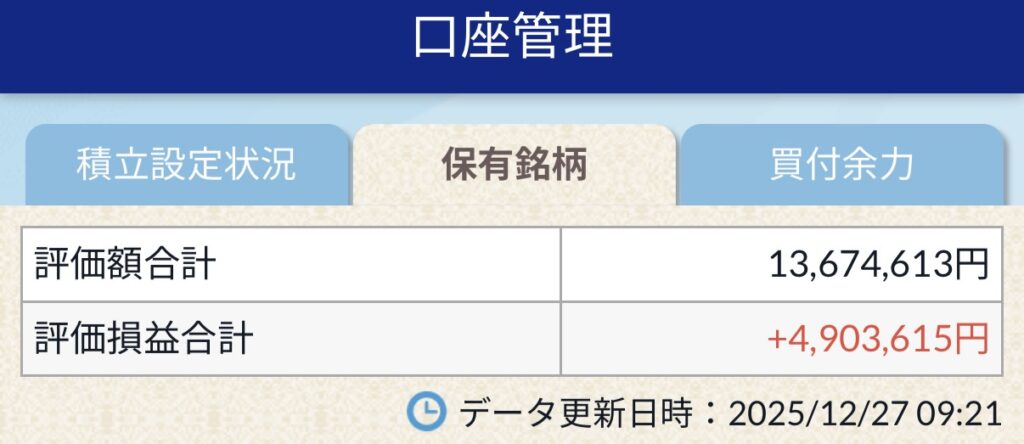 評価額合計は13,674,613円になりました。1,300万円台の中で行ったり来たりを繰り返しています。