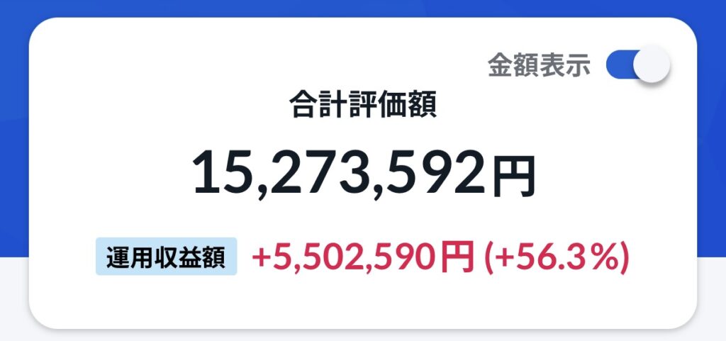 合計評価額は15,273,592円。背中は見えていたのに遠かった1,500万円を4月に入り、ついに達成。