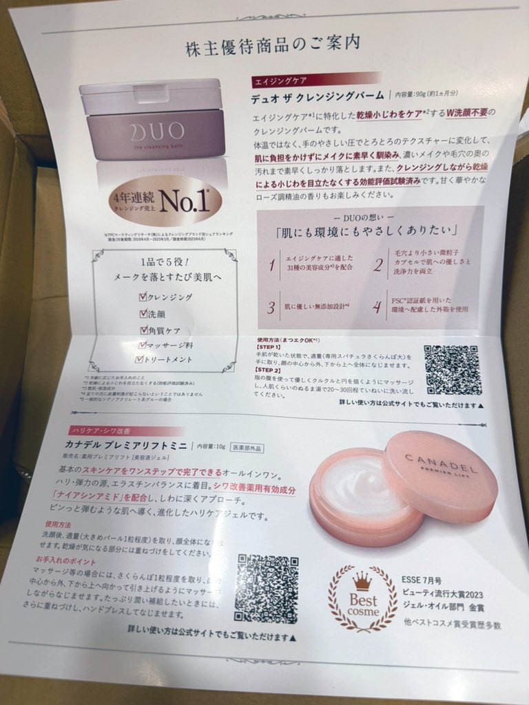 (今年に限り、株主番号を登録しなかった方にはクレンジングバーム90gが自宅に届くそうです。)