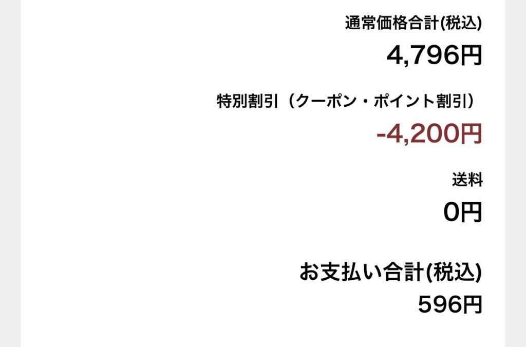 4,200円の株主優待ポイントと送料無料クーポンを使い、残り596円をお支払いしました。