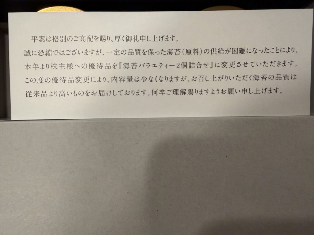 直近株価で、10万円弱の投資で海苔がもらえるというわけです。