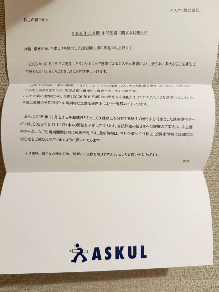アスクルから2025年11月分の株主優待が到着しました。