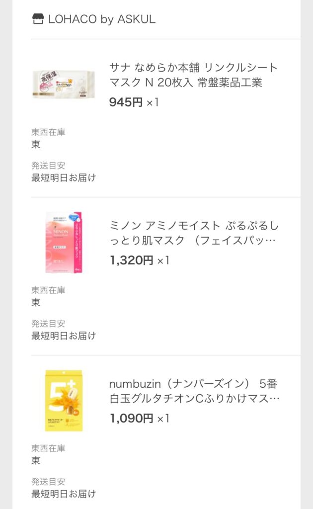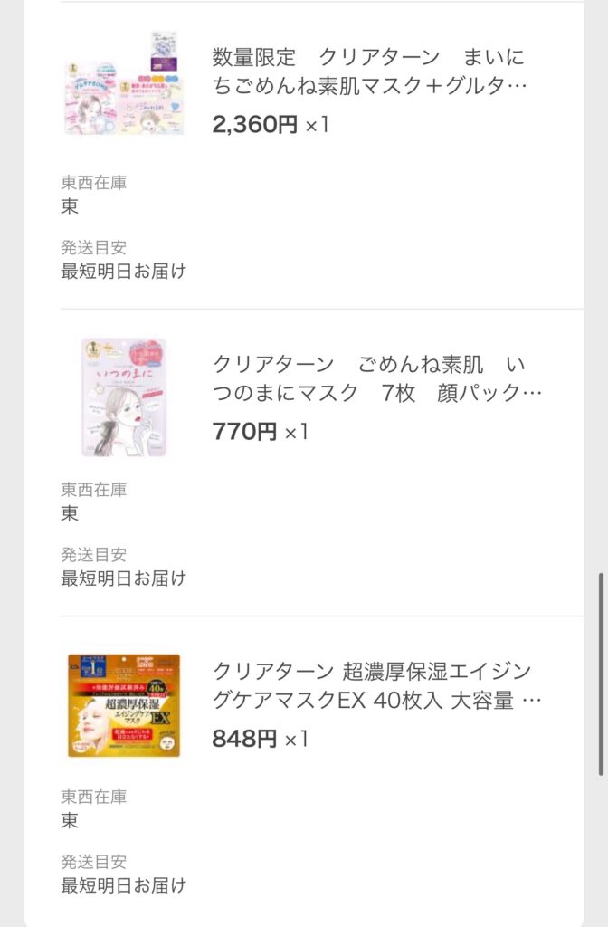 商品選択のポイントは、株主でもあるコーセーが出しているフェイスパック(クリアターンシリーズ)をメインで購入したこと。
